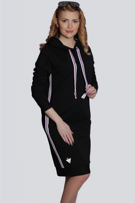 Стильное спортивное женское платье из трикотажа, как нельзя лучше подходит для повседневной носки, не сковывает движений. Платье с капюшоном имеет свободный силуэт и модную длину. В боковых швах модели спрятаны карманы. Бока декорированы лампасами. Изделие выполнено из качественного трикотажа \"двунитка\", приятного к телу и практичного в эксплуатации. Состав трикотажа: 75% хлопок, 20% полиэстер, 5% спандекс.