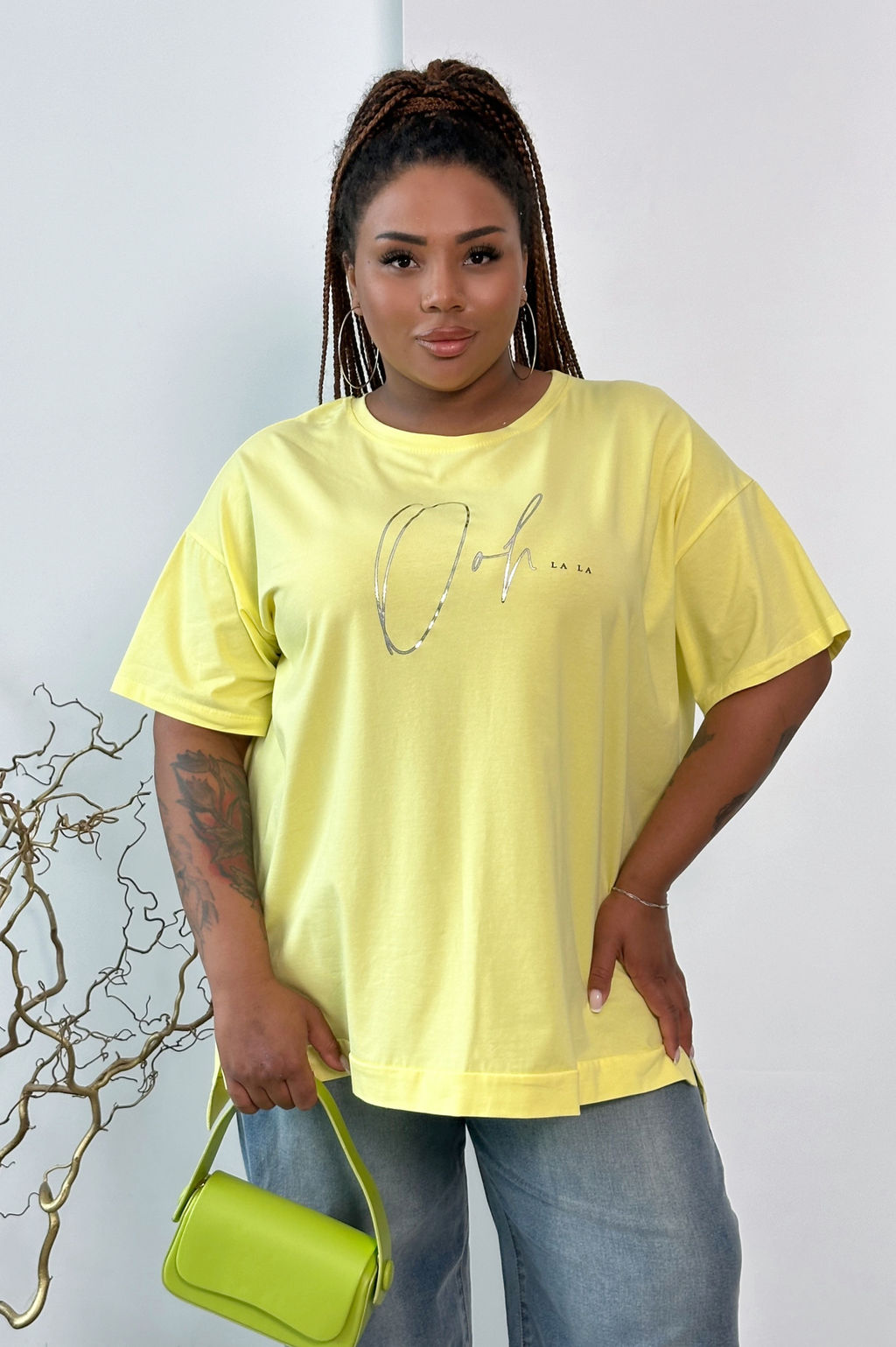 Футболка прямого кроя из мягкого трикотажа. Модель имеет круглый вырез с узким кантом по краям и короткие цельнокроеные рукава. Свободный силуэт искусно обыгрывает фигуру и не сковывает движений. Удлиненная спинка и небольшие разрезы по бокам обеспечивают оптимальную посадку по фигуре. Оригинальная надпись на груди освежает образ и добавляет нарядности. Модель легко сочетается с любым низом, поэтому скомбинировать чудесный и стильный образ с легинсами, брюками, шортами и джинсами не составит труда.­
