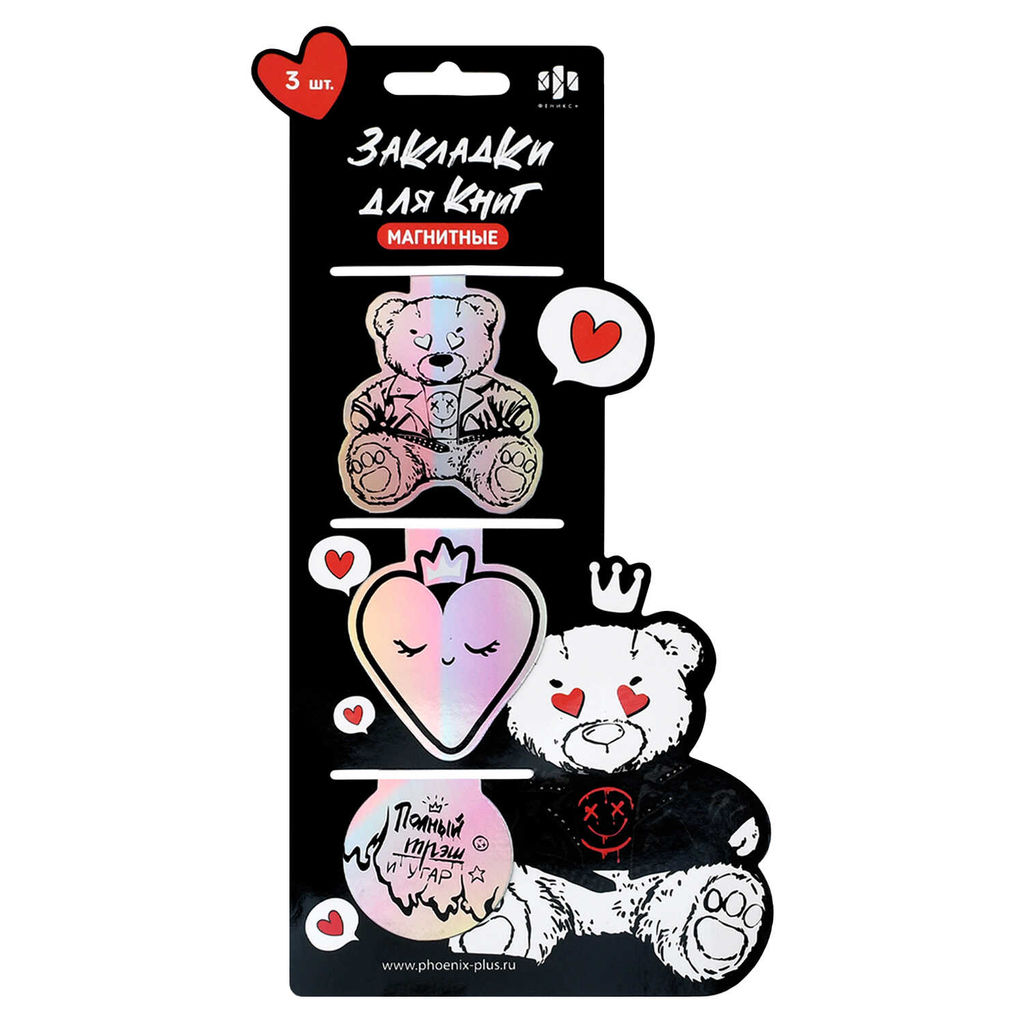Набор закладок магнитных для книг арт. 72033 / 50 РОЗОВЫЙ МИКС (3 шт. в наборе, размер 52x62; 51x62; 43x44 , материал: голографическая бумага, ферроагломерированный полимер; цвет: белый, чёрный, декор: фигурная вырубка, шелкография в две краски, особенности: глянцевая ламинация, индивидуальная упаковка: подложка с европодвесом из мелованного картона + ПЭТ-пакет)