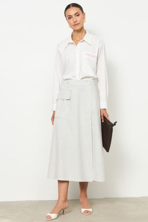 Юбка из костюмной ткани прямого силуэта с запахом. На передней части изделия выполнен накладной карман с клапаном. Пояс притачной с застёжкой на пуговицы. Изделие с запахом не только выглядит интересно, но и делает фигуру более гармоничной.