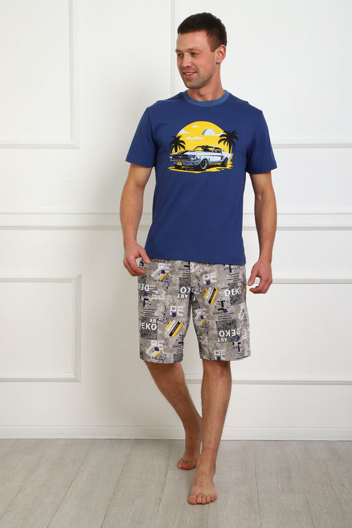 Костюм мужской: футболка с атмосферным принтом на груди, с короткими рукавами и шорты на эластичном поясе, с боковыми карманами. Комфорт 100% хлопка.