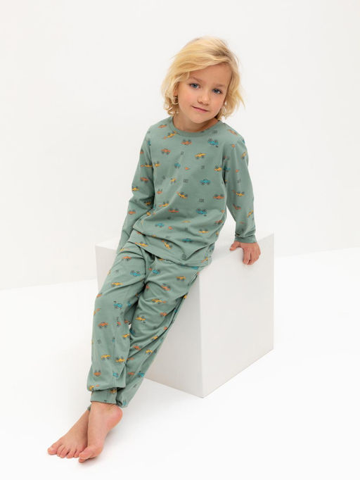 Трикотажная пижама из натурального хлопка. Джемпер с длинными втачными рукавами и брюки с эластичной резинкой в поясе. Мягкие манжеты по низу брюк. Оригинальная набивка выполнена из стойких гипоаллергенных текстильных гипоаллергенных красителей. Изделие сохраняет цвет и форму после многократных стирок. Все трикотажные полотна производятся в соответсвии с нормами швейцарского сертификата ЭкоТекс.. Состав: 100% хлопок