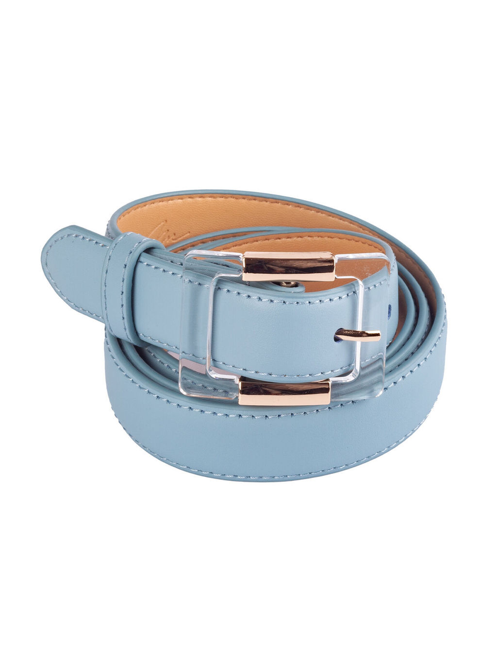 Ремень женский из высококачественной натуральной кожи голубого цвета с дымчатым подтоном с модной прозрачной пряжкой оттенит достоинства любой фигуры и поднимет градус женственности и утонченности.