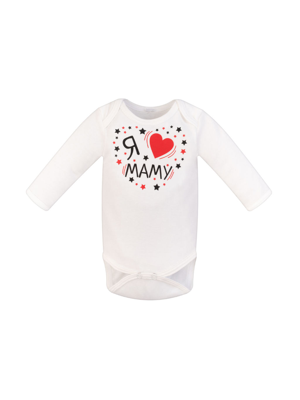 В прохладном помещении или на улице малышу будет комфортно в трикотажном боди с длинными рукавами. На пройме ног есть удобные кнопки-застёжки – спинка ребёнка всегда будет надёжно прикрыта от сквозняков. Оформление плечиков внахлёст облегчит процесс надевания бодика. Выпускается изделие из нежного хлопкового интерлока молочного цвета – мягкого, нежного, хорошо переносящего стирки трикотажа. Спереди принт " Я люблю маму " .