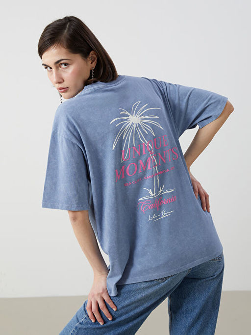Bisiklet Yaka Bask?l? Oversize Kad?n Ti??rt