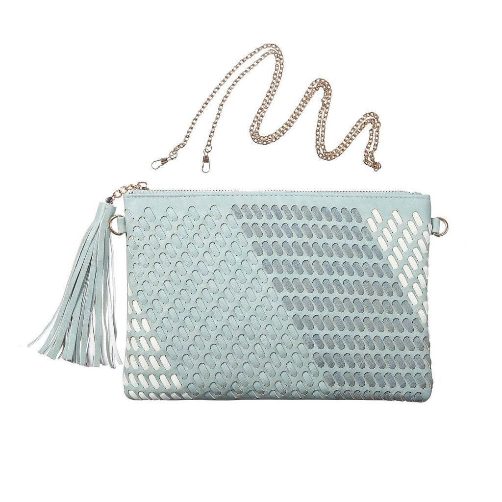 Модный клатч-конверт из искусственной кожи нежного бирюзового цвета. Декорирован с лицевой стороны оригинальным переплетением полосок из искусственной замши. Застежка - молния, украшена кисточкой из искусственной кожи в цвет основного изделия. В комплекте есть длинная цепочка, которая позволяет носить клатч также и на плече. Внутри одно отделение и один карман на молнии. Размер:18 * 25 см