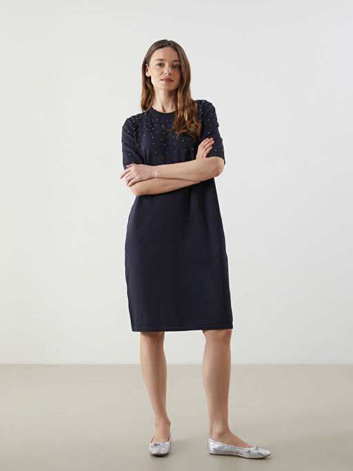 Bisiklet Yaka Boncuk ??lemeli Triko Elbise
