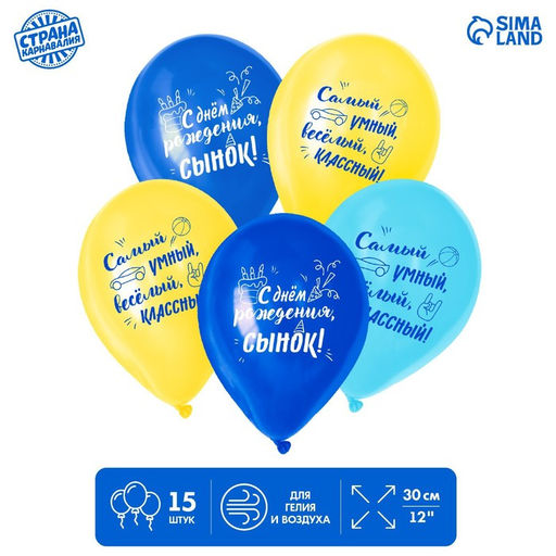 • Воздушные шары латексные 12" «С днём рождения, для сына», 15 шт.