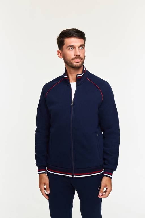 Тип материала: футер трехниточный с начесом ? Футер трехниточный с начесом мягкое плотное трикотажное полотно с высоким изнаночным начесом. Состав полотна 65% хлопка, 35% полиэстера. Изделия из этого полотна обладают высокими теплозащитными свойствами, очень удобны как для повседневной носки, так и для занятия спортом в холодное время года. Изделия из трехниточного футера очень хороши для детской одежды, сочетая теплоту и мягкость с хорошей воздухопроницаемостью и легкостью, не требуют особенного ухода, износостойкие. Спортивный костюм с воротником-стойкой, из трехниточного плотного трикотажа с начесом по изнанке.Рукава покроя реглан. Куртка застегивается на молнию.Прорезнные карманы куртки с молниями.На брюках два кармана спереди и один карман сзади справа, все карманы прорезные с молниями. Посадку по фигуре обеспечивает эластичный полосатый подвяз пришитый по низу куртки и манжетам. Брюки зауженные с манжетами. Пояс брюк по линии талии с эластичной тесьмой дополнительно регулируется шнуром.
