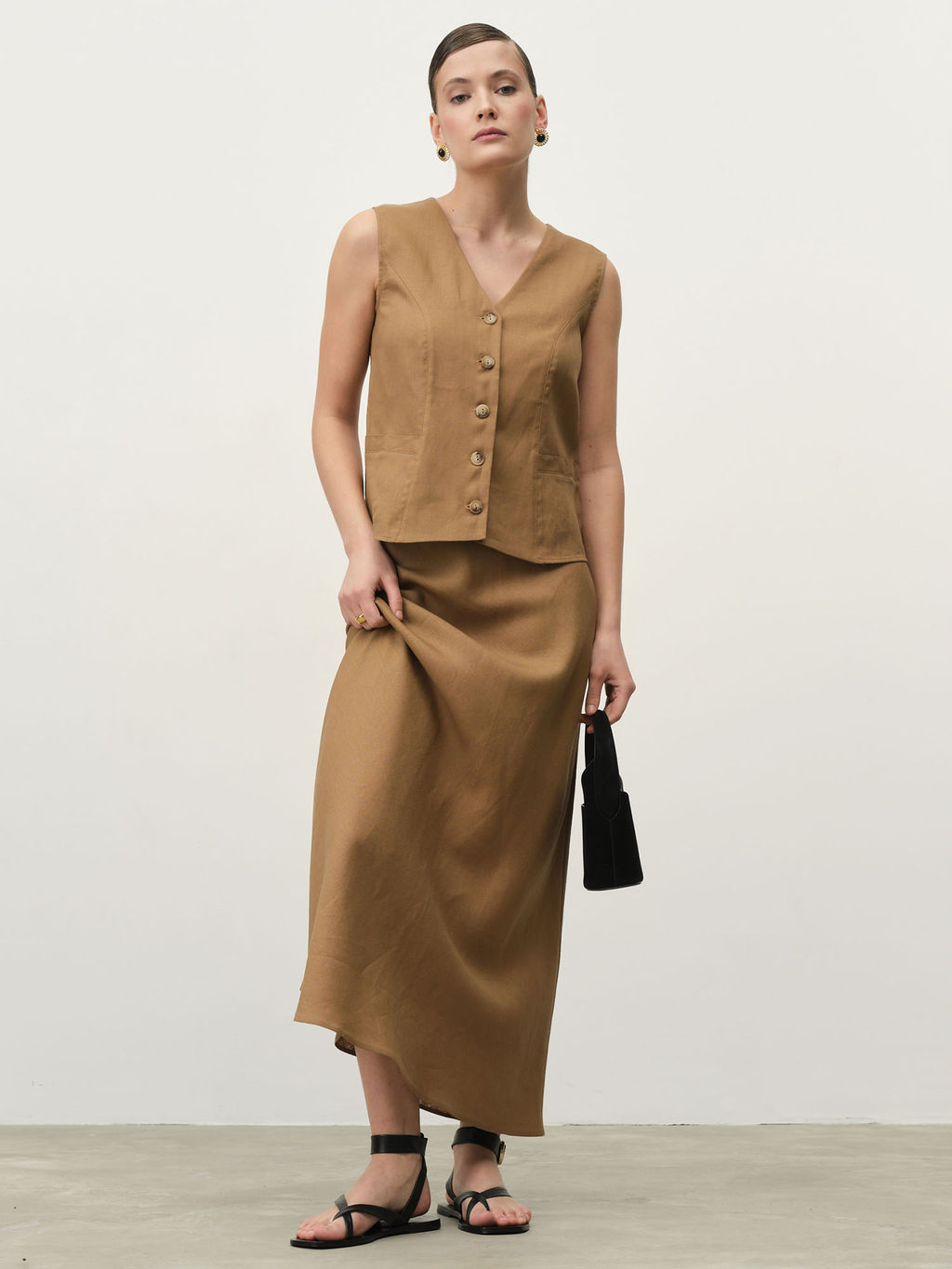 Классический крой с V-образным вырезом подчеркивает линию декольте, а лаконичная пуговичная застежка добавляет функциональности и элегантности. Практичные карманы не только служат декоративным элементом, но и являются удобной деталью для повседневного использования. Структурированный силуэт создает стройный, подтянутый образ, при этом не сковывая движений. Универсальный теплый оттенок кэмел делает этот жилет исключительно многофункциональной вещью в гардеробе. Носите его в комплекте с льняными брюками для создания завершенного монохромного образа или комбинируйте с контрастными цветами для более яркого лука. Льняной жилет станет базовым элементом как делового, так и повседневного гардероба. В офис его можно надеть поверх блузы или рубашки, а для неформальной встречи сочетать с футболкой или топом.