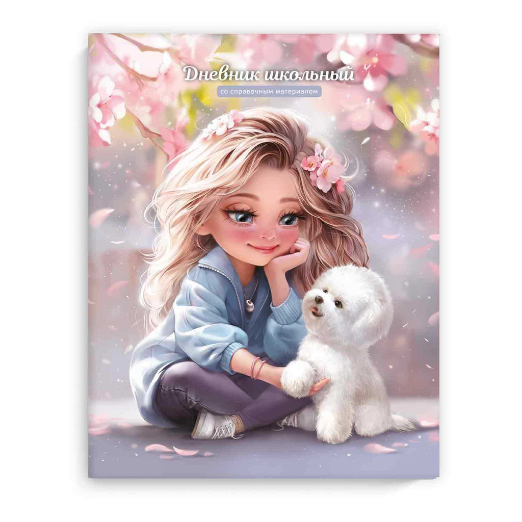 Дневник школьный арт. 69742 БЛОНДИНКА С СОБАЧКОЙ / интегральный переплёт, А5+, 48 л., выборочный УФ-лак, матовая ламинация, печать в одну краску, универсальная шпаргалка/