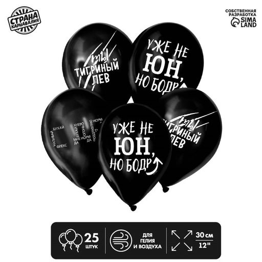 В набор входят шары с надписями:С ДРтвой внутренний стержень - шило вты тигриный левмужик сказал, мужик...сказалуже не юн, но бордКоличество шаров может отличаться от представленного на фото Набор: Да. Диаметр, дюйм: 12. В наборе, шт.: 25. Тематика праздника: День рождения. Тематика рисунка: День Рождения. Тематика рисунка: Разное. Вид шара: Классический. Надувка шара: Воздухом. Надувка шара: Гелием. Язык надписи: Русский. Бесплатная доставка: Да. Наша разработка: Да.