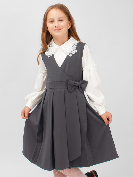 Очаровательный сарафан для девочки Соль&Перец из плотного трикотажа, с подкладом и юбочкой в складку. Сарафан декорирован бантиком из основной ткани. Износоустойчивый материал позволит надолго сохранить форму и привлекательный внешний вид изделия. Идеальный выбор для создания стильного, школьного образа.
