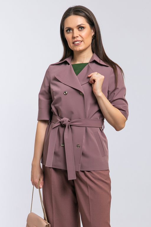 Состав: костюмная ткань - ПЭ 60%, вискоза 35%, эластан 5%. Длина изделия: 66см. Оригинальный жакет прямого силуэта из плотной костюмной ткани, на подкладе. Модель с отложным воротником на стойке и двубортной застежкой на пуговицы спереди. По бокам переда прорезные карманы с листочками. Укороченные втачные рукава украшены отворотом, внутренняя часть выполнена из контрастной ткани. В боковых швах вставлены шлевки под пояс из основной ткани, который идет в комплекте.