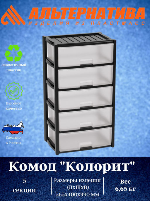 Комод произведен из высококачественного и безопасного полипропилена. Особую прочность комоду придает его цельная конструкция перегородок. Комод имеет выдвижные и достаточно вместительные ящики. На крышке и перегородках предусмотрены ограничители, благодаря которым ящик не будет вылетать при открывании. Такой комод станет отличным решением для организации хранения практически в любой комнате вашей квартиры или дома.