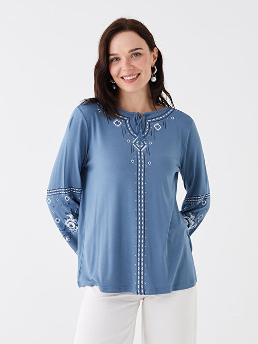 Ba?lamal? Yaka Bask?l? Uzun Kollu Kad?n Bluz
