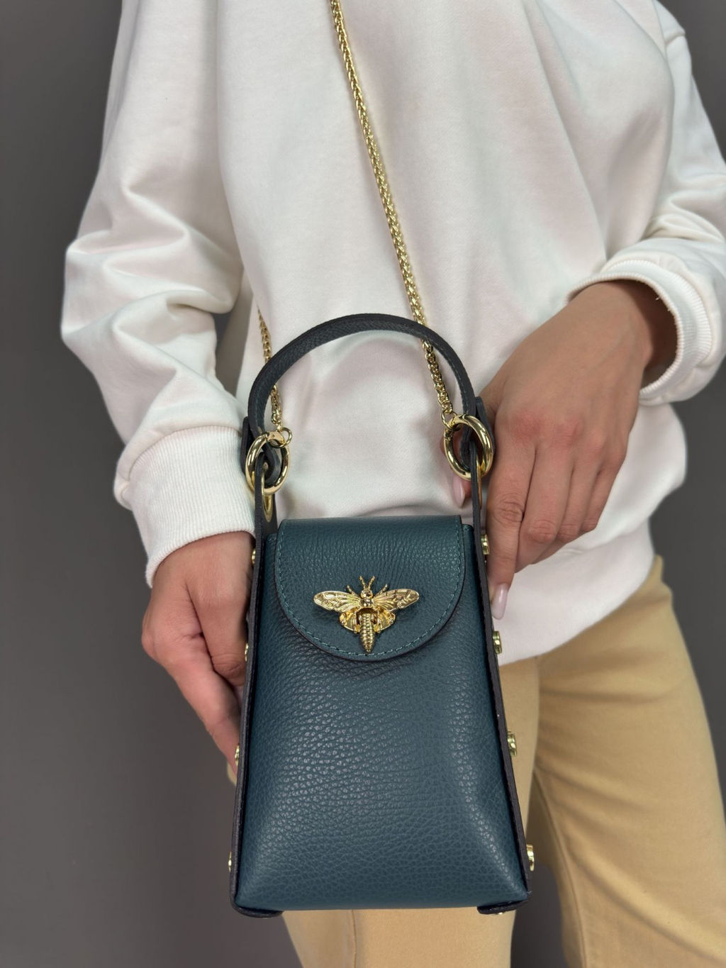 Страна: Италия Акции: Товары со скидкой Производитель: Pelletteria Luisa, Italy Размер: маленькая Стиль ношения: на ремешке через плечо Форма: жесткая Выделка кожи: зернистая износостойкая Цвет кожи: Бирюзовый Оттенок: темно-бирюзовый Упаковка: Пакет тканевый L, 40x40 см Палитра цветов: TB-105944 Dollaro Размеры: длина: 13 см \tвысота: 21 см \tширина: 6 см Описание: Красивая аккуратная необыкновенно модная женская сумка кросс-боди из натуральной кожи. Базовая коллекция Sefaro, Италия. Особенности сумки: замок в виде золотой бабочки, плечевой ремень-цепочка, а также заклепки на боковых стенках сумки - фурнитура высокого итальянского качества. Все эти элементы непременно привлекут к вам внимание окружающих своей яркостью и оригинальностью исполнения. Сумочка имеет каркасную форму, компактная, выполнена из зернистой телячьей кожи, может использоваться как повседневная модель, но подойдет и для торжественного случая - элегантно дополнит вечерний образ по типу клатча, либо подчеркнет сдержанный лук. Закрывается сумка на крышку с застежкой, внутри один отдел, в котором поместится всё самое необходимое. На дне сумки металлические защитные ножки. Можно носить в руке, либо на изящной цепочке через плечо (длина 110см) - очень удобно!