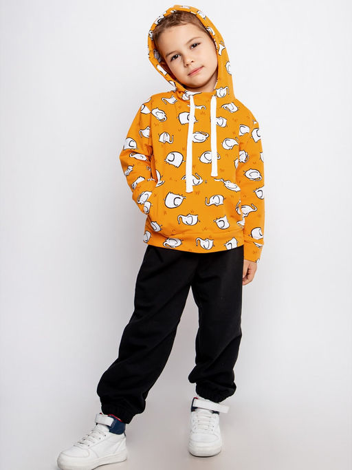 Кофта с капюшоном свободного силуэта. Брюки с мягкой резинкой по талии и манжетами по низу брючин. Плотный и эластичный трикотаж футер-петля хорошо пропускает воздух, не теряет формы, способен удерживать тепло. Отличный вариант для дома или прогулки в холодное время года.