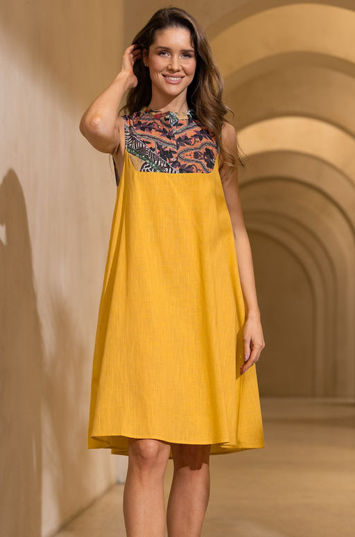 Платье Mia-Amore длинной чуть выше колен с воротником-стойкой и застежкой на пуговицы по вырезу горловины, выполнено из смесовой ткани хлопка со льном. Кокетка полочки и спинки выполнены из принтованной ткани, а основные детали полочки и спинки из однотонного компаньона. Состав:60% хлопок, 40% лён