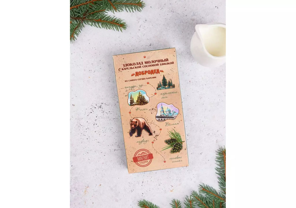 Молочный шоколад с карельской сосновой шишкой это необычное и утонченное лакомство, сочетающее сладость молочного шоколада с уникальным вкусом сосновой шишки. Сосновая шишка придает шоколаду легкую хвойную нотку, которая гармонично сочетается с кремовой текстурой молочного шоколада. Это лакомство станет идеальным выбором для любителей экзотических вкусов, а также будет отличным подарком для тех, кто ценит натуральные и необычные сочетания.