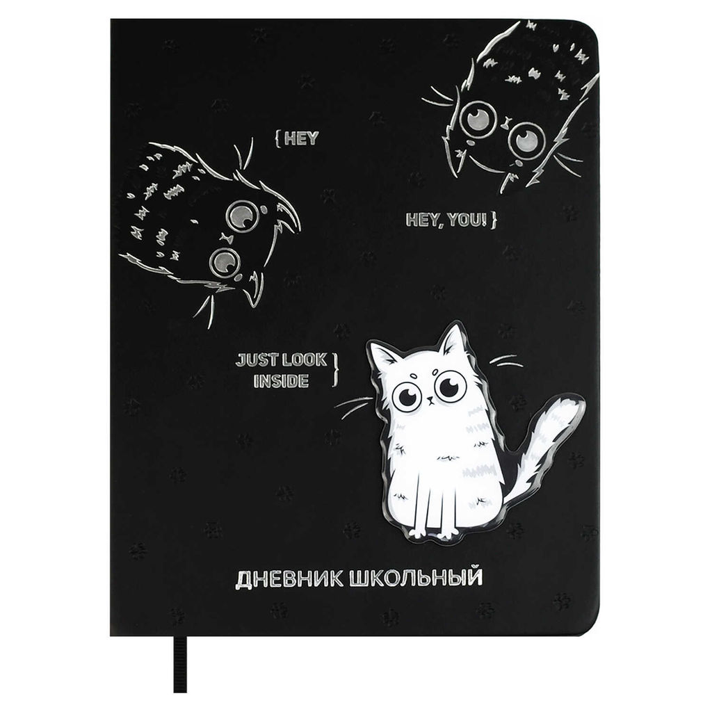 Дневник школьный арт. 68724 / 15 ТРИ КОТА (кожзам: А5+; твёрдый переплёт, материал обложки: искусственная кожа "Виннер"; декор: аппликация из пластика, блинтовое тиснение, тиснение фольгой; способ крепления блока: ниткошвейный; вн. блок: 48 л., белый офсет 80 г/м?, печать в одну краску, справочный материал: универсальная шпаргалка; отделка среза: окрашивание пантоном; закладка: одно ляссе; форзац: печать в одну краску; индивидуальная упаковка: ПЭТ-пакет)