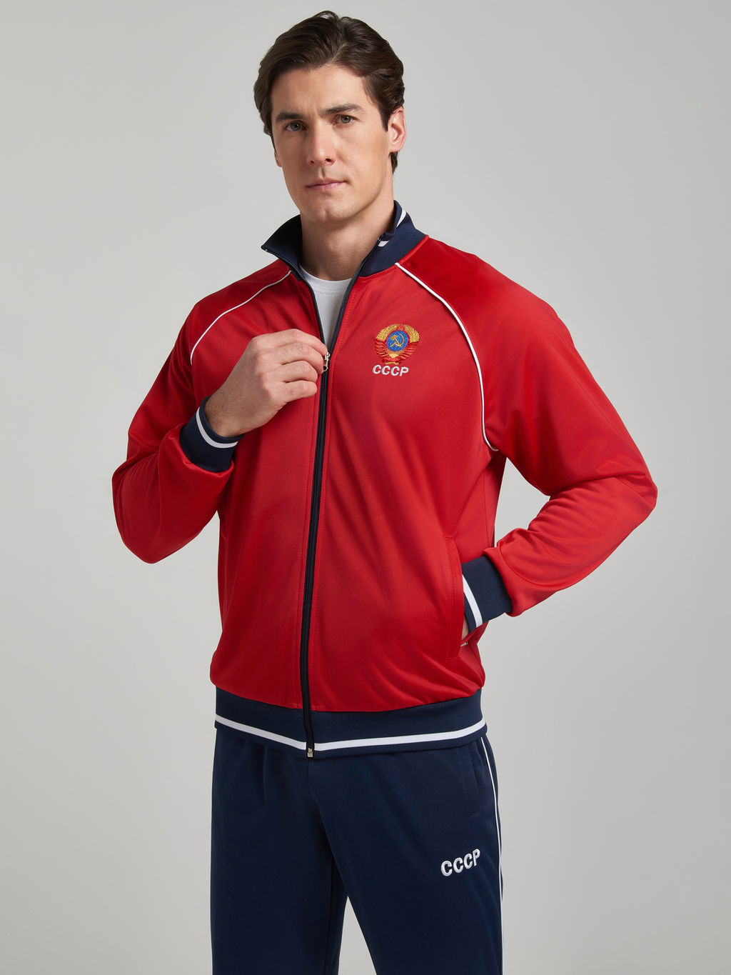 Яркий мужской спортивный костюм в символике СССР. Выполнен из трикотажного полотна с изнаночным начесом. Куртка прямого силуэта, с воротником, на поясе, застегивается на молнию. Рукава покроя реглан. По швам втачивания рукавов проложен белый кант. Карманы куртки на молниях. Воротник, пояс и манжеты куртки из полосатого трикотажного полотна. На груди курки слева вышит герб СССР, на спинке куртки - вышивка-аппликация СССР. Брюки прямые, по боковым швам - белые канты, карманы брюк прорезные, с молниями. Пояс брюк эластичный, по линии талии дополнительно регулируется шнурком.