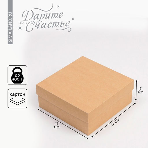 Форма: Квадратная. Плотность, г/м²: 250. Длина, см: 17. Ширина, см: 17. Высота, см: 7. Допустимый вес вложения, г: 400. Тематика: Однотонная. Символ года: Нет. Тематика праздника: Универсальная тематика. Марка картона: КРАФТ-КАРТОН SVETOCOAT. Вид: Складные коробки. Размер: Малый (11-17 см). Бесплатная доставка: Да. Наша разработка: Да.