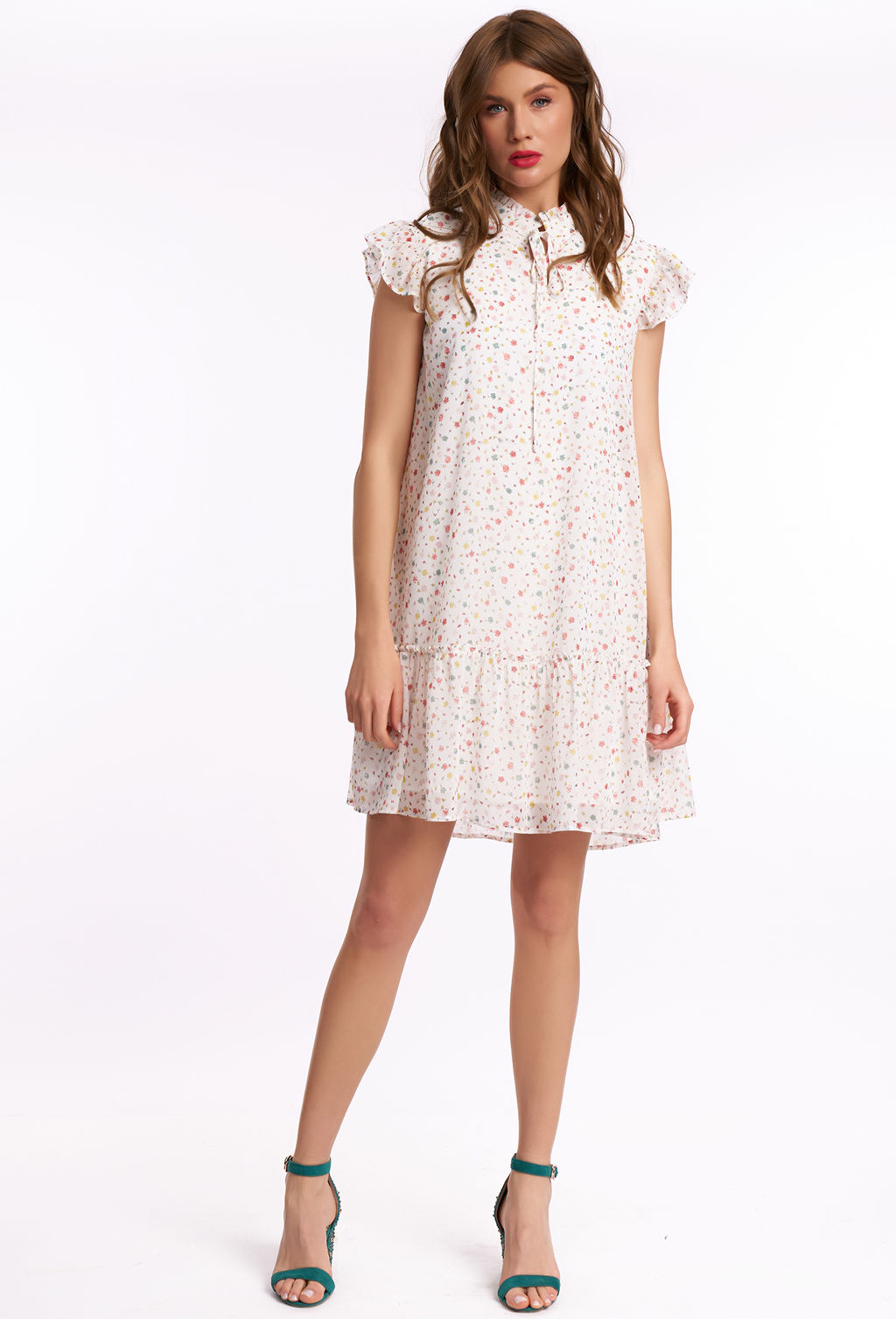 Лёгкое женское платье умеренного объема, расширенное к низу. Перед с разрезом по горловине. Рукав крылышко на сборке. Воротник стойка с притачной рюшей по верху и завязками. Низ платья с настрочным воланом. Платье на вискозной подкладке, длиной до линии колена.