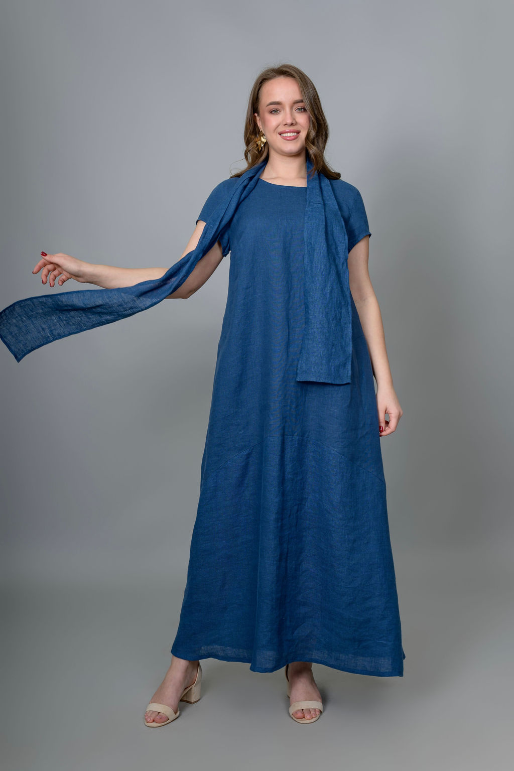 Стильное длинное платье из 100% льна обеспечит комфорт и ощущение свежести. Свободный фасон А-силуэта мягко садится на фигуру, скрывает лишнее и не ограничивает движений. Универсальный крой подходит для разных типов телосложения, включая большие размеры. А в сочетании со стильными аксессуарами позволяет создавать комплекты для работы, вечеринок, прогулок, праздников и торжеств. Оригинальность модели в комбинации разных фактур ткани и в дополнении образа длинным шарфиком.­