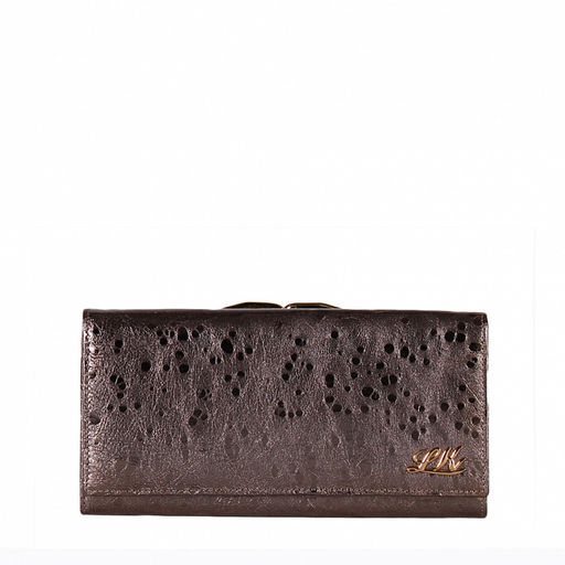 Полноразмерный кошелек, выполнен из натуральной кожи. Дополнен золотистой фурнитурой. Закрывается на кнопку.