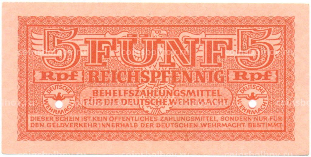 • Банкнота 5 рейхспфеннигов 1944 года Германия (Вспомогательное платежное средство для вермахта)