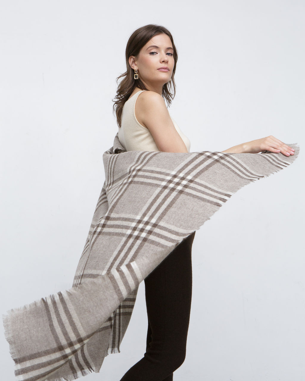 Теплый шерстяной платок с классическим клетчатым узором. Натуральный материал мягко укутывает и согревает в прохладную погоду. Легко сочетается с повседневными и элегантными образами. Идеальный аксессуар для стильного и комфортного лука.­