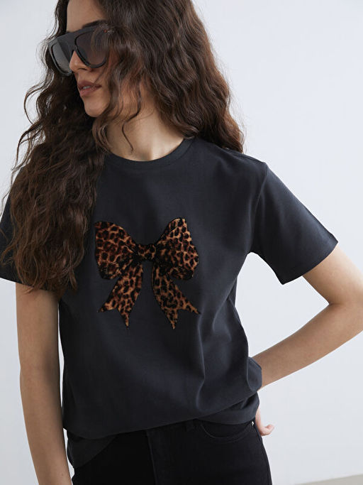 Bisiklet Yaka Fiyonk Bask?l? Kad?n Ti??rt