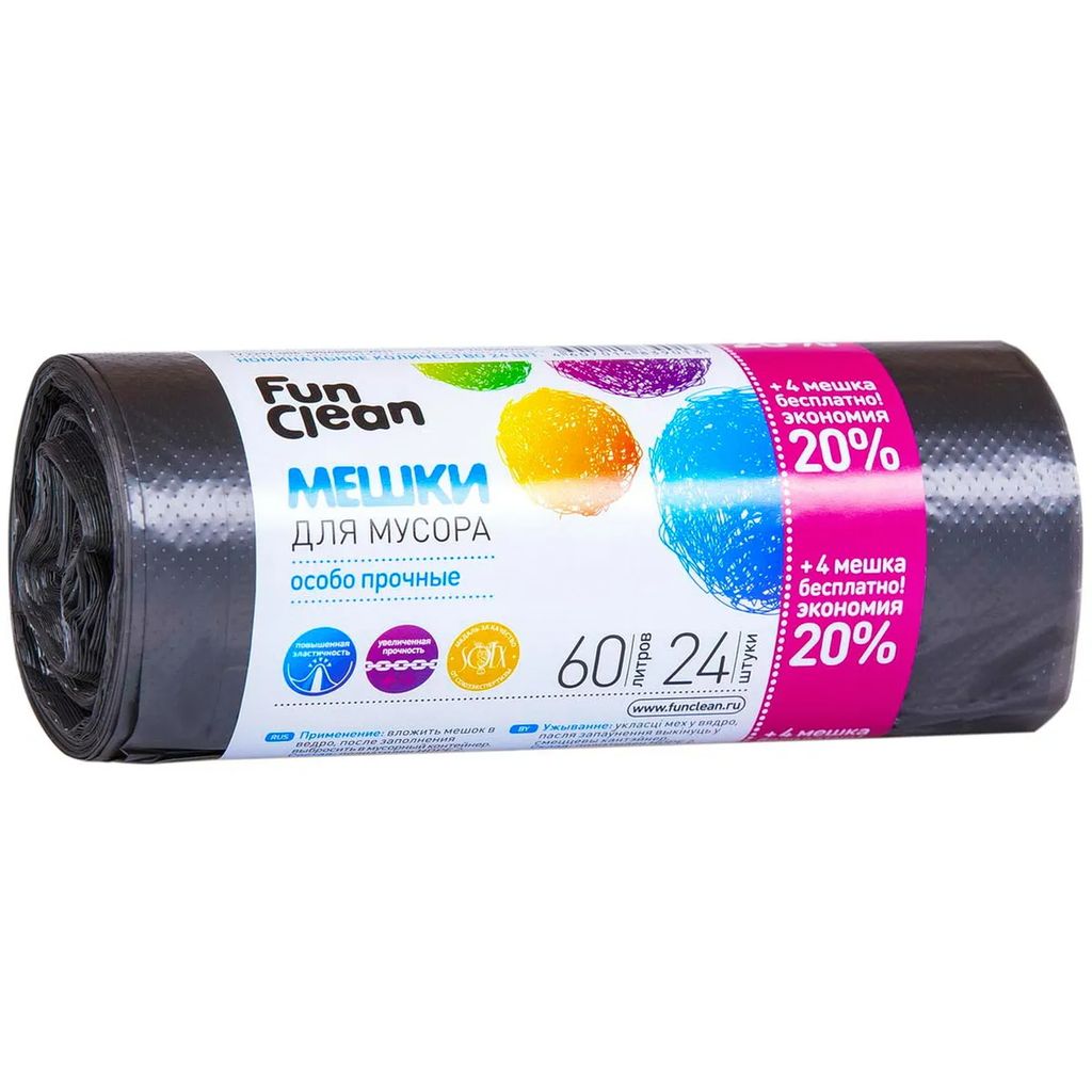 Внешний вид товара может отличаться от фотографий на сайте. Мешки для мусора Fun Clean, 60 л, 20 шт., цвет черный, мусорные пакеты для дома, офиса и дачи. Особо прочные мусорные пакеты это универсальное и экономичное решение задач по утилизации мусорных отходов и хранению бытовых предметов. Мусорные мешки в сравнении со стандартными аналогами имеют повышенную эластичность и устойчивость к проколам за счет специально разработанной рецептура состава базового сырья и современных российских технология производства. Особый способ спайки дна мешка позволяет равномерно распределять нагрузку внутри и значительно увеличивает общую грузоподъемность изделия. Мусорные мешки легко и быстро отрываются от рулона по линии перфорации. Мусорные пакеты не пропускают жидкие бытовые отходы и прочую влагу. Экономичные, прочные, герметичные, гигиеничные и практичные мусорные пакеты для вашего дома.