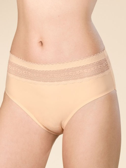 Женские трусы-слипы с высокой посадкой. Изготовлены по бесшовной технологии с минимум швов. Кромки по ноге и по талии подогнуты и приклеены, хлопковая приклеенная ластовица. Нежное геометричное кружево по линии талии высотой 5 см не передавливает тело и не натирает кожу. Модель оценят те, кто ищет незаметное и невесомое белье на каждый день или особого случая.