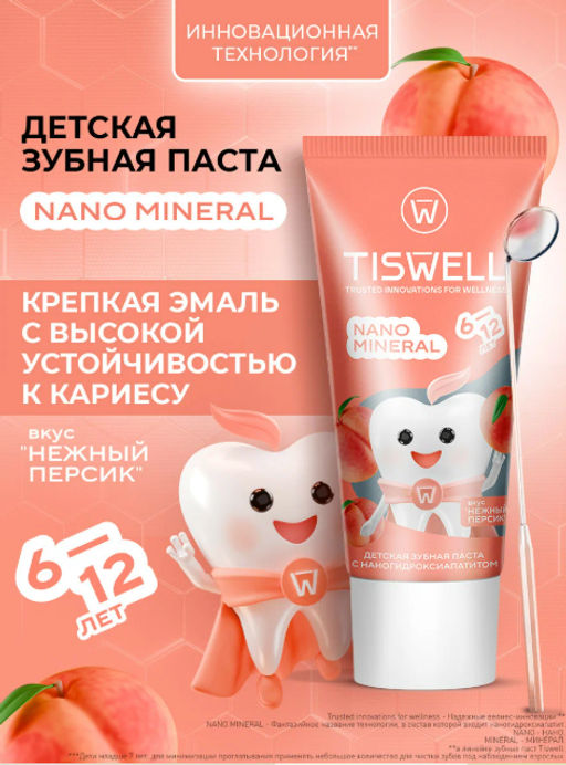 Зубная паста детская для 612 лет со вкусом персика способствует укреплению эмали зубов. Детская зубная паста Tiswell безопасна при случайном проглатывании**. Укрепляющая зубная паста с наногидроксиапатитом Tiswell нейтрализует бактерии, вызывающие кариес, и поддерживает баланс микрофлоры полости рта.