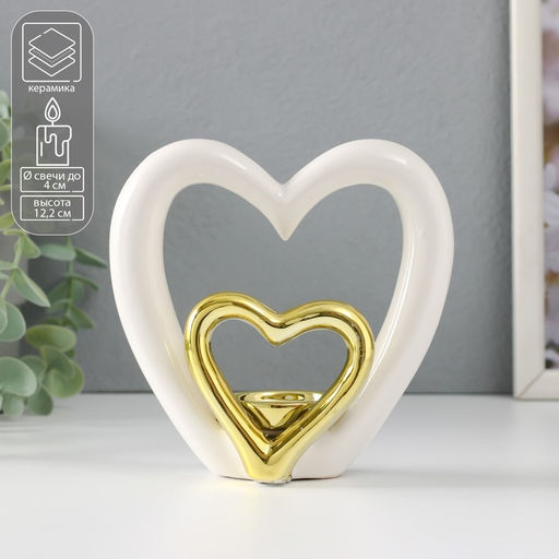 • Подсвечник на 1 свечу Сердце в сердце, белое с золотом, 12.7?5.5?12.2 см