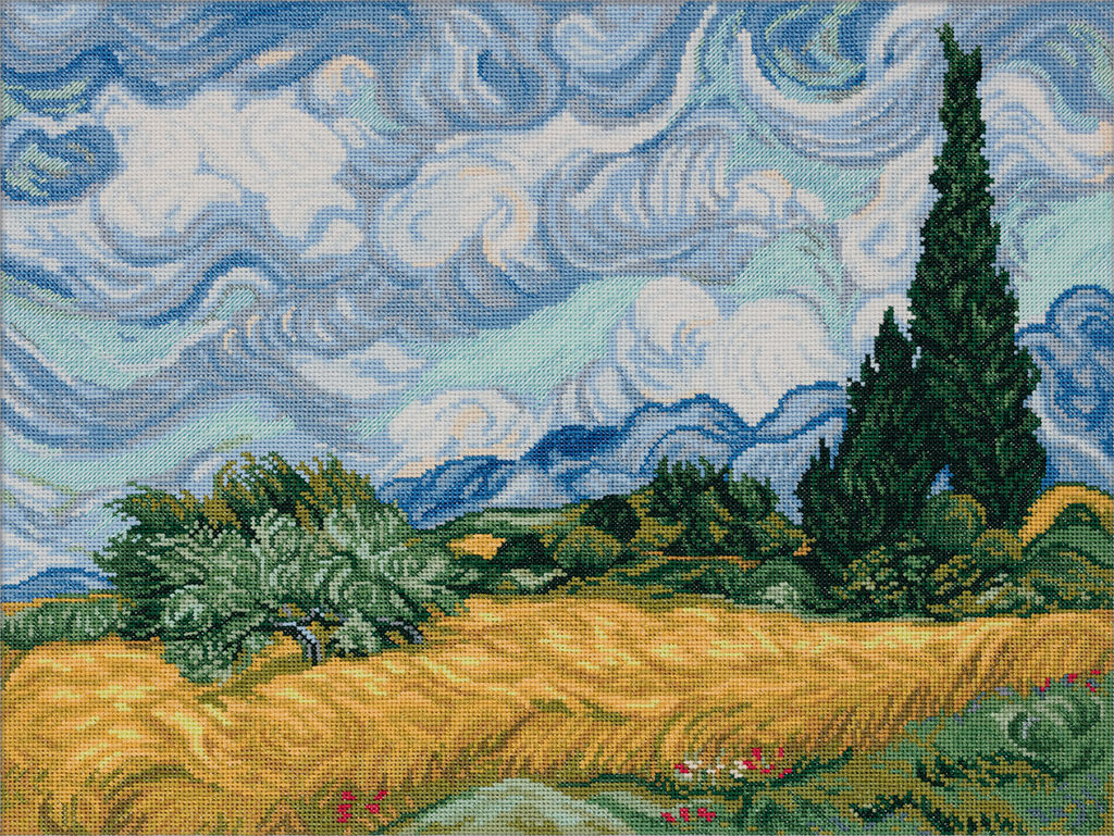 Описание Новая коллекция наборов для вышивания в технике счетный крест от PANNA создана по мотивам Шедевров Мирового Искусства! В набор входит все необходимое: - подробная инструкция по вышиванию, - Ч/б схема с цветными символами, - Канва Аида №16, - х/б нитки мулине Gamma, - иглы для вышивания Gamma. Пшеничное поле с кипарисами Винсент ван Гог (голландец, 1853-1890) Масляная живопись, 72.1 х 90.9 см, 1889