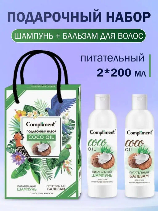 Описание товара Подарочный набор COCO OIL от Compliment включает питательный шампунь и бальзам по 200 мл, созданные для заботы о сухих и поврежденных волосах. Это идеальное решение для восстановления здоровья ваших локонов и придания им блеска. Формулы продуктов обогащены натуральными маслами, которые глубоко питают и увлажняют волос, улучшая их структуру и внешний вид. Шампунь бережно очищает волосы и кожу головы, устраняя все загрязнения, при этом не пересушивая их. Он обладает нежной текстурой и приятным ароматом, что превращает процесс мытья волос в настоящее удовольствие. Питательный бальзам завершает уход, интенсивно увлажняя и восстанавливая волос, делая его более мягким, сильным и шелковистым. Этот набор станет отличным подарком для близких, заботящихся о своем образе. Удобная упаковка и стильный дизайн делают его не только полезным, но и эстетически приятным.