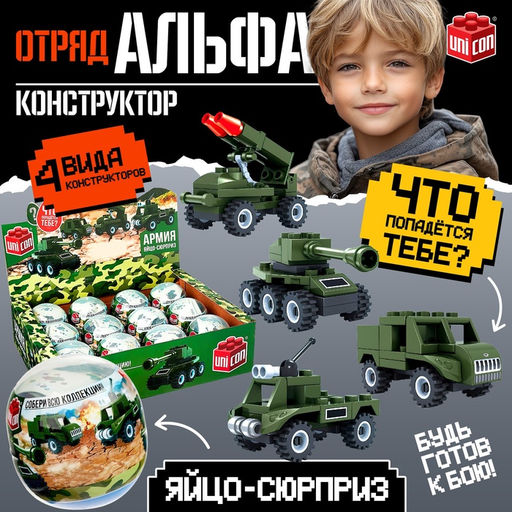 С конструктором-сюрпризом «Армия» ребенок почувствует себя настоящим водителем военной техники! Малышу попадётся одна из четырёх реалистичных машинок, с помощью которых можно не только весело провести время, но и развить важные навыки.ОсобенностиЛёгкая сборка. Детали конструктора легко соединяются и разъединяются.Типовые детали конструктора совместимы с наборами Ausini, Qman, Sluban, Cogo, Peizhi, Jie Star и Unicon.Игрушка выполнена из высококачественных материалов, не содержит вредные вещества и токсины.Размеры яйца — 7 × 6,3 см.Играем с пользойИгра с конструктором способствует развитию:мелкой моторики,координации движений,пространственного мышления,внимания,воображения. Тип питания: Без источника питания. Для кого: Для мальчика. Возраст: От 5 лет. Среднее время сборки, мин: 15. Тематика праздника: 23 Февраля. Тематика конструктора: Военные. Дополнительные функции: Без функций. Тип механизма: Без механизма. Батарейки в комплекте: Нет. Уровень сложности: Начальный. Среда перемещения транспорта: Наземный транспорт. Тематика назначения: Специальный транспорт. Размер деталей: Классические детали. Бесплатная доставка: Да. Наша разработка: Да. Примечание: Выбор конкретных цветов и моделей не предоставляется. На фотографиях могут быть представлены не все варианты..