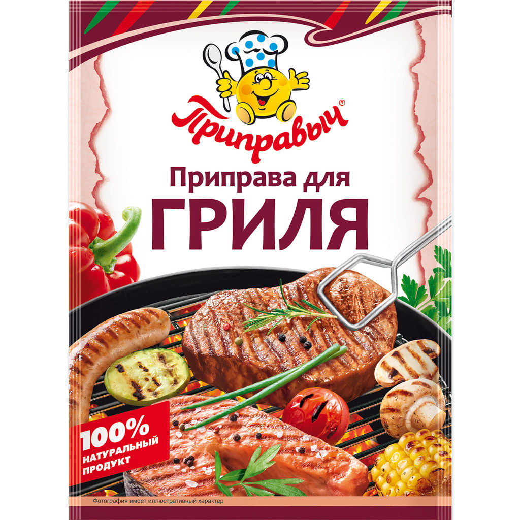 А знаете ли Вы что слово "Гриль" в переводе означает "решетка". В гриле можно приготовить самые различные блюда: можно запечь мясо, птицу, рыбу, сосиски, овощи, грибы и даже фрукты! Гриль откроет перед Вами неограниченные возможности в приготовлении вкусных и полезных блюд. Пища, приготовленная в гриле, не только очень вкусна и аппетитна на вид, но и весьма полезна, потому что готовится без дополнительного жира. А наша приправа дополнит вкус ваших аппетитных блюд ароматом специй и пряных трав! Натрите приправой продукты перед жаркой на гриле, или добавьте её в маринад. Состав: перец черный, перец душистый, паприка красная хлопьями, паприка зеленая хлопьями, кориандр, семя горчицы, лук, чеснок, майоран, пряности, соль.