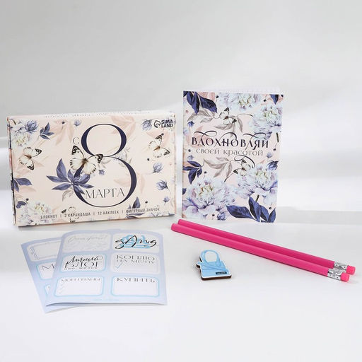 Для кого: Для женщины. Для кого: Для девочки. Формат: А6. Линовка блока: Клетка. Тип скрепления: На скобе. В наборе, шт.: 4. Количество листов: 32. Отделка: Без отделки. Вид упаковки: Коробка. Тематика праздника: 8 Марта. Адресат: Без адресата. Составляющие набора: Значок. Составляющие набора: Карандаши. Составляющие набора: Наклейки. Составляющие набора: Блокнот. Возраст: Для взрослых. Вид обложки: Мягкая. Дизайн обложки: С рисунком. Бесплатная доставка: Да. Наша разработка: Да.