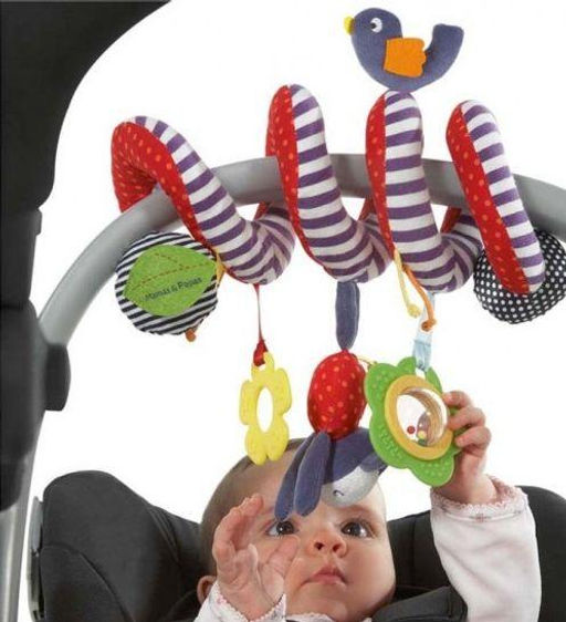 Состоит из 4 игрушек - птичка, прорезыватель в виде цветочка, мягкий бегемотик-погремушка и цветочек с круглой погремушкой с шариками внутри. Заявленная длина 65 см, но так как сшита спиралька достаточно туго, то в намотанном виде занимает сантиметров 25. Ширина: 16 см. Упаковка: полиэтилен.
