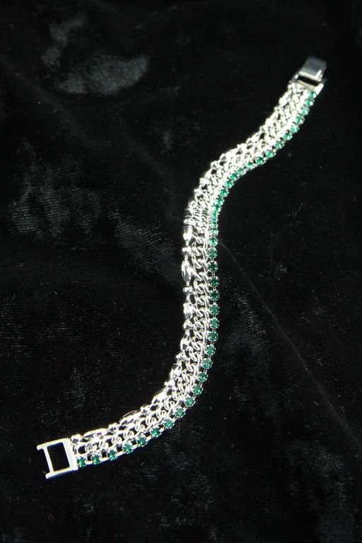 Очаровательный браслет, выполненный из металла цвета серебра, украшенный фианитами зеленого цвета.