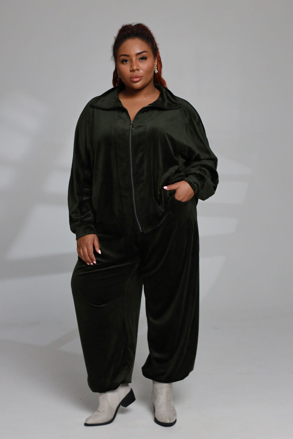 Костюм велюровый, с высоким воротником, темно-зеленый