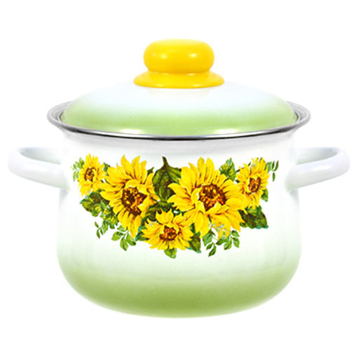 • "Подсолнухи" Кастрюля эмалированная 2л, д17см, h12,5см, коническая форма, металлическая крышка с пластмассовой ручкой-кнопкой, ободок из нержавеющей стали, с тонированием, белый (Россия)