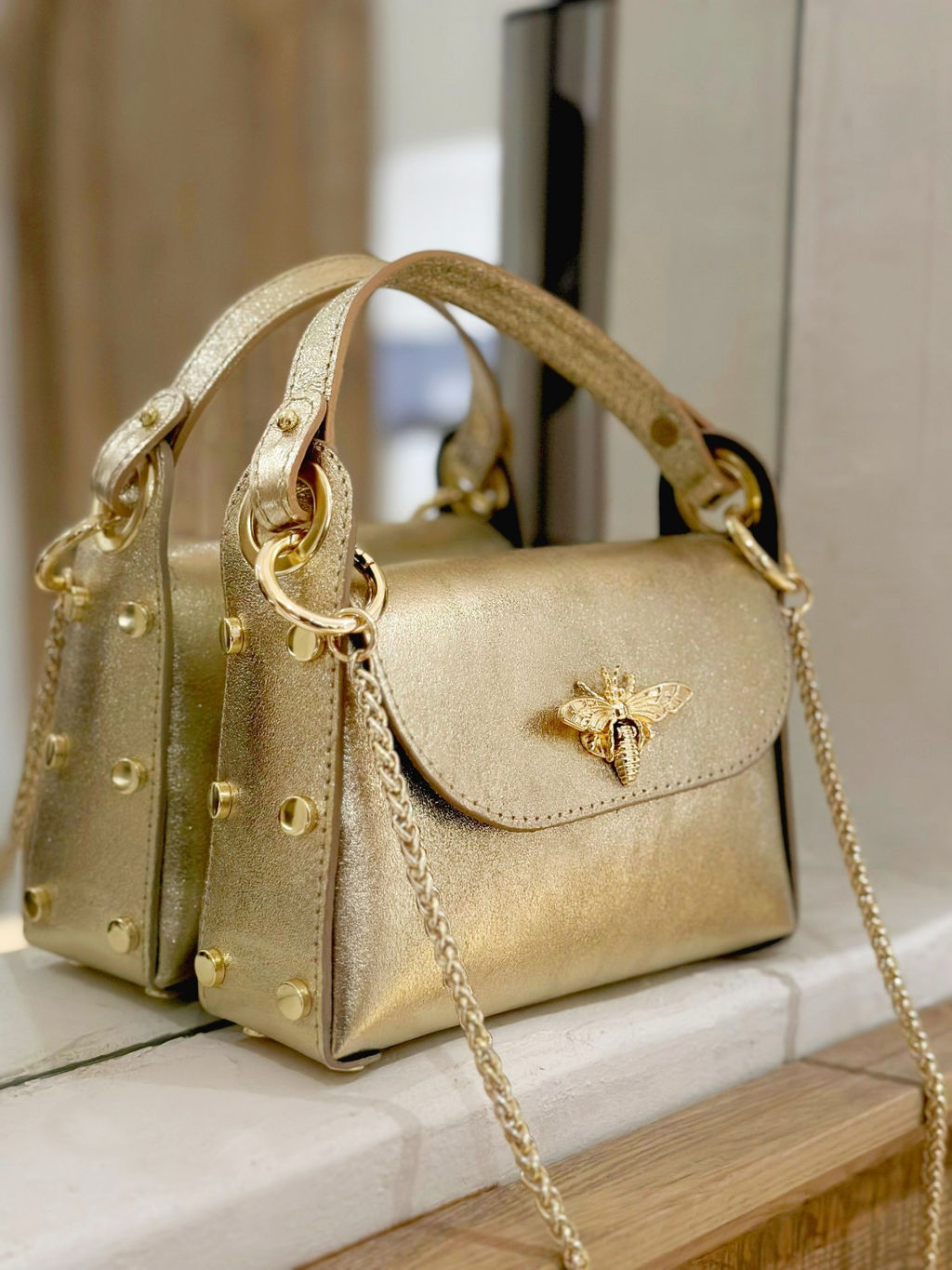 Главные особенности модели: кросс-боди, замок в виде золотой бабочки, съемный плечевой ремень-цепочка, а также заклепки на боковых стенках сумки - используется фурнитура высокого итальянского качества в золотом цвете. Все эти элементы непременно привлекут к вам внимание окружающих своей яркостью и оригинальностью исполнения.