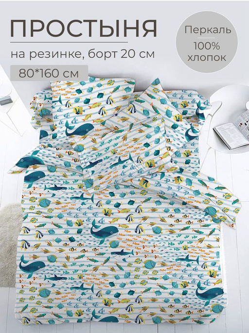 Артикул: Простыня на резинке 080*160 см, перкаль, детская расцветка (По волнам)