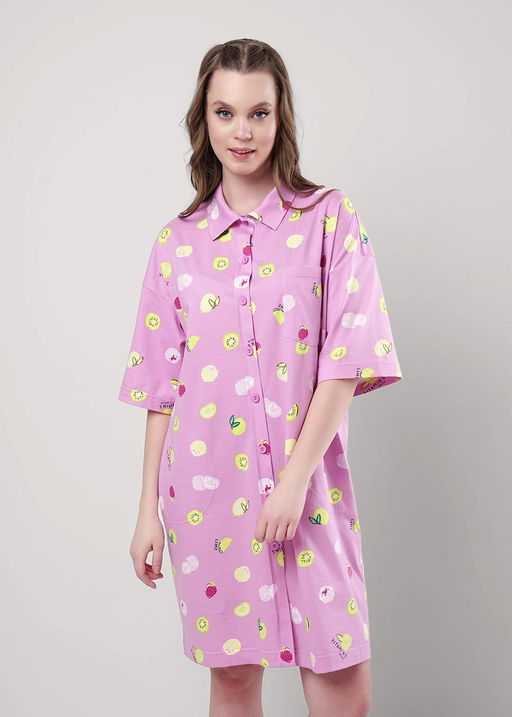 Халат для дома свободного прямого кроя из хлопкового трикотажного полотна, с застежкой на пуговицы. Короткий рукав со спущенной линией плеча.По горловине отложной воротник,по борту цельновыкроенная планка.Спереди накладной карман, в боковых швах карманы.