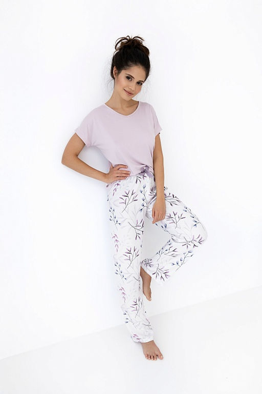 Пижама Suzelle состоит из футболки и прямых брюк. Футболка с v-образным вырезом горловины. Брюки с цветочным принтом и на широкой резинке. Идеальный вариант не только для сна, но и для домашнего отдыха. Брюки: хлопок 100% Состав: вискоза 94%, эластан 6%. Страна: Польша